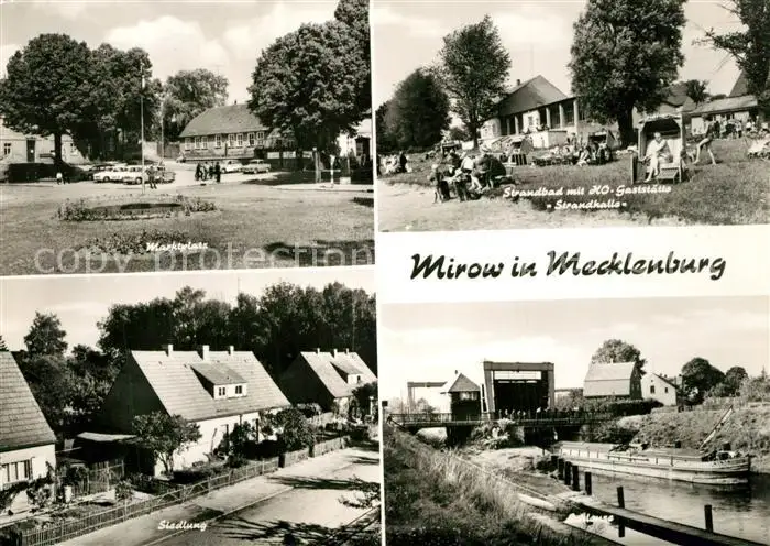 AK / Ansichtskarte Mirow Marktplatz Siedlung Strandbad HO Gaststaette Strandhalle Schleuse Mirow