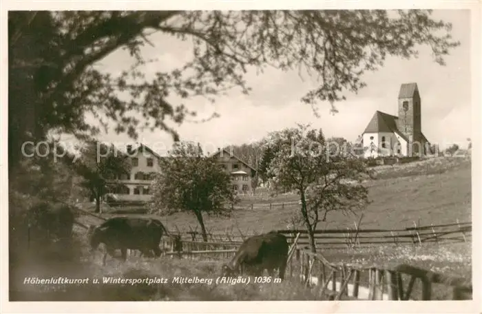 Mittelberg_Oy Viehweide Kuehe Blick zur Kirche Mittelberg Oy postalisch gelaufen 1941 Erhaltung siehe scans [FriedD77] Frierer