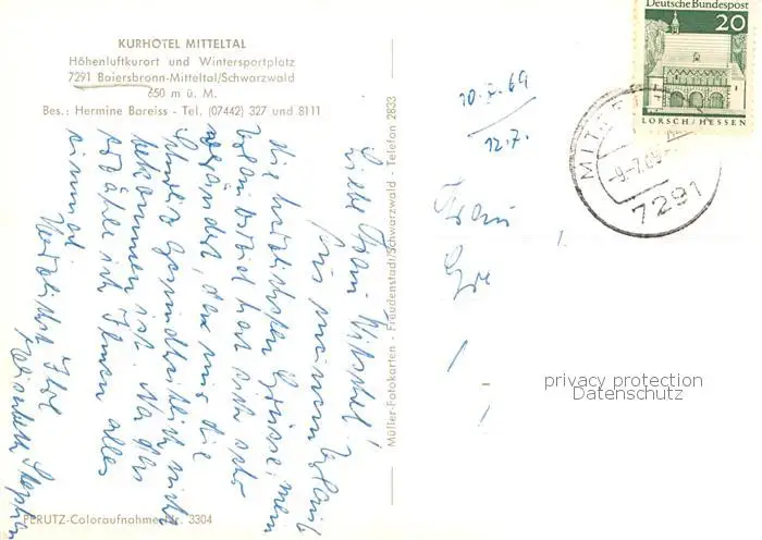 Mitteltal_Schwarzwald Kurhotel Mitteltal Mitteltal Schwarzwald postalisch gelaufen 1969 Erhaltung siehe scans [FriedD77] Frierer