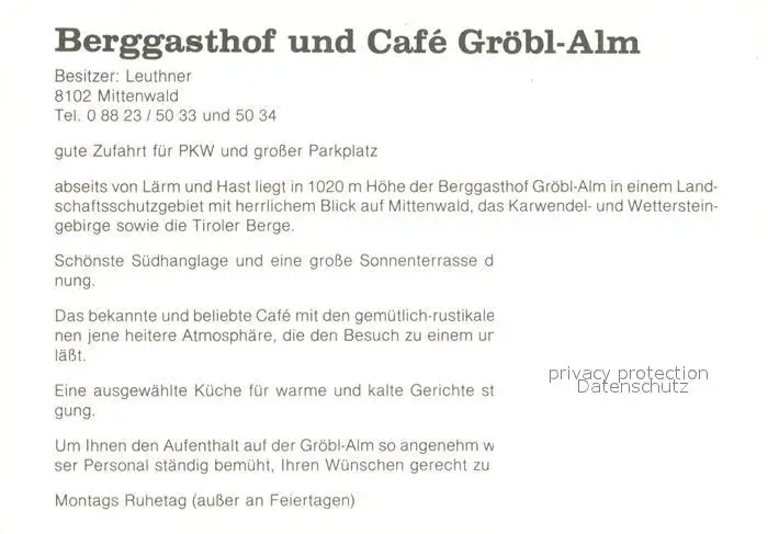Mittenwald_Bayern Berggasthof Cafe Groebl Alm Alpen Mittenwald Bayern postalisch nicht gelaufen nach 1965 Werbekarte (keine Postkarte) Erhaltung siehe scans [FriedD77] Werbekarte (keine Postkarte) Frierer
