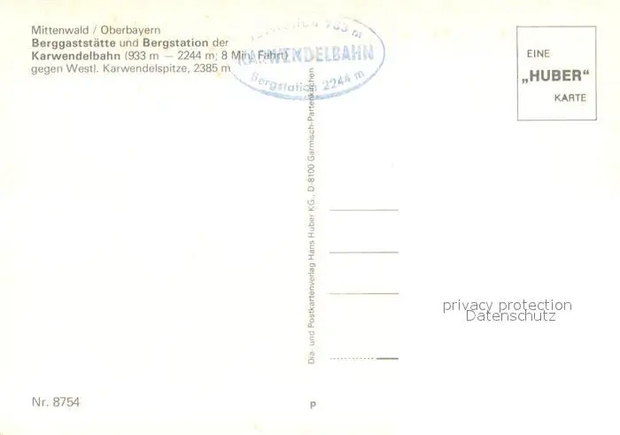 Mittenwald_Bayern Berggaststaette und Bergstation Karwendelbahn Gebirgspanorama Huber Karte Nr 8754 Mittenwald Bayern postalisch nicht gelaufen nach 1965 Erhaltung siehe scans [FriedD77] Frierer