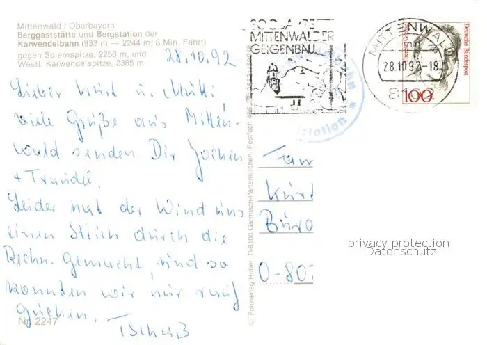 Mittenwald_Bayern Berggaststaette und Bergstation der Karwendelbahn Fliegeraufnahme Mittenwald Bayern postalisch gelaufen 1992 Erhaltung siehe scans [WerneD78] WernPID7