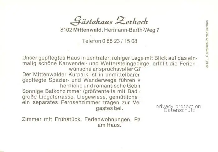 Mittenwald_Bayern Gaestehaus Zerhoch Restaurant Fremdenzimmer Mittenwald Bayern postalisch nicht gelaufen nach 1965 Werbekarte (keine Postkarte) Erhaltung siehe scans [FriedD77] Werbekarte (keine Postkarte) Frierer