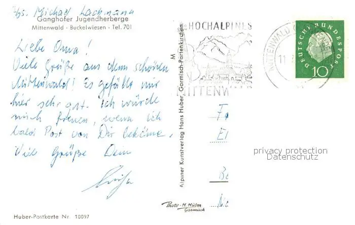 Mittenwald_Bayern Ganghofer Jugendherberge gegen Wettersteinspitze Wettersteingebirge Mittenwald Bayern postalisch gelaufen 1961 Erhaltung siehe scans [FriedD77] Frierer