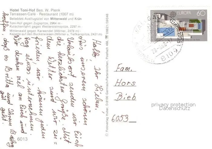 Mittenwald_Bayern Hotel Tonihof Mittenwald Bayern postalisch gelaufen 1968 Erhaltung siehe scans [LiesaD40] LiesID40
