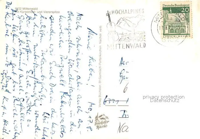 Mittenwald_Bayern Karwendel Viererspitze Mittenwald Bayern postalisch gelaufen 1970 Erhaltung siehe scans [KathaD81] Kathoren