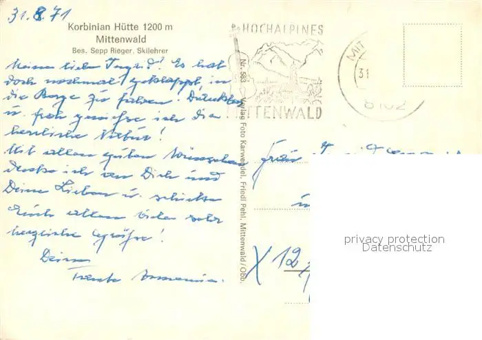 Mittenwald_Bayern Korbinian Huette Terrasse Brunnen Mittenwald Bayern postalisch gelaufen 1971 Erhaltung siehe scans [WerneD78] WernPID7