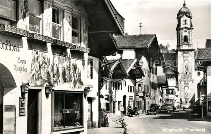 AK / Ansichtskarte Mittenwald_Bayern Obermarkt Fassadenmalerei Kirche Mittenwald Bayern