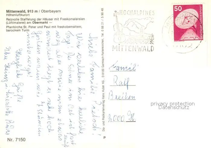Mittenwald_Bayern Obermarkt Freskomalerei Pfarrkirche Sankt Peter und Paul Turm Mittenwald Bayern postalisch gelaufen nach 1965 Erhaltung siehe scans [KathaD81] Kathoren