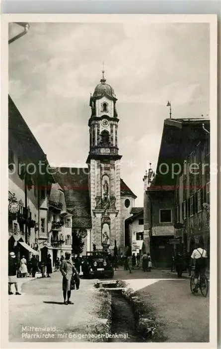 AK / Ansichtskarte Mittenwald_Bayern Pfarrkirche mit Geigenbauer Denkmal Mittenwald Bayern