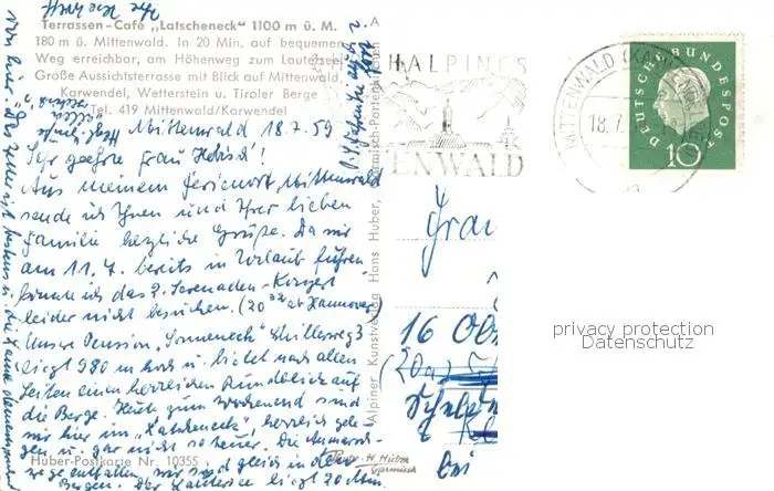 Mittenwald_Bayern Terrassencafe Latscheneck Mittenwald Bayern postalisch gelaufen 1959 Erhaltung siehe scans [FriedD77] Frierer