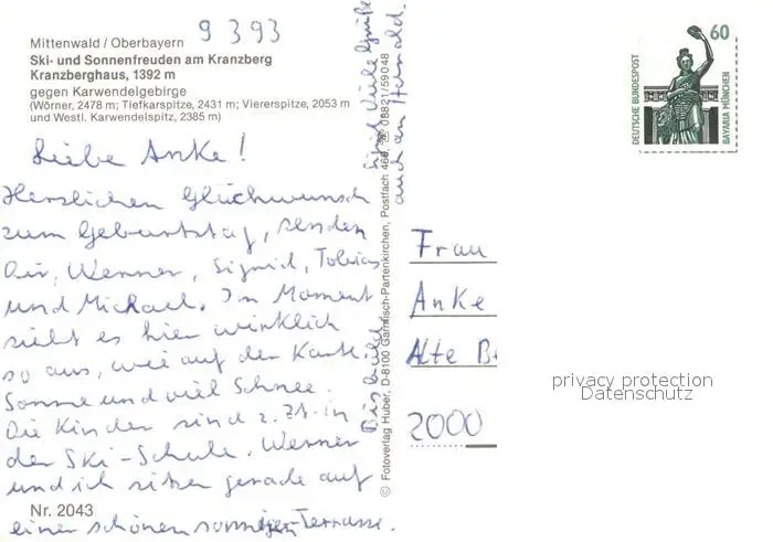 Mittenwald_Bayern Wintersportplatz am Kranzberg Kranzberghaus gegen Karwendelgebirge Mittenwald Bayern postalisch nicht gelaufen 1993 Erhaltung siehe scans [FriedD77] Frierer
