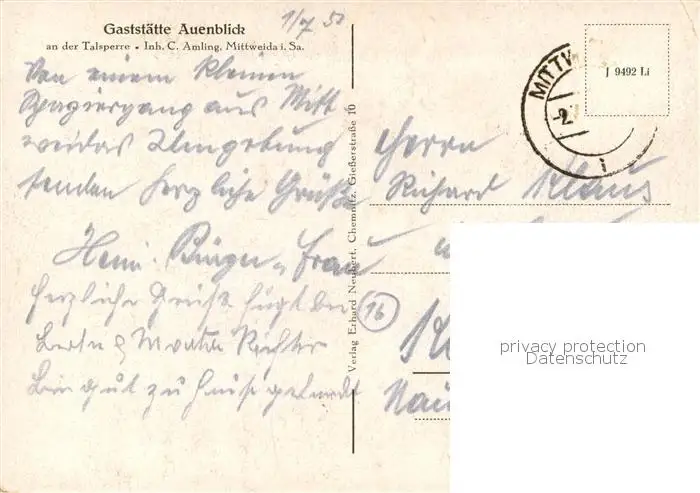 Mittweida Gaststaette Auenblick Landschaftspanorama Talsperre Mittweida postalisch gelaufen ca. 1955 Erhaltung siehe scans [FriedD77] Frierer