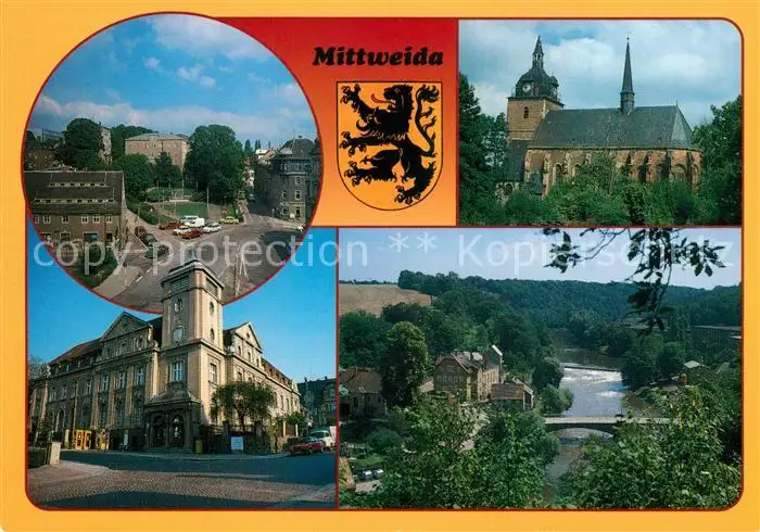AK / Ansichtskarte Mittweida Technikumplatz Stadtkirche Post Panorama Zschopautal Wappen Mittweida