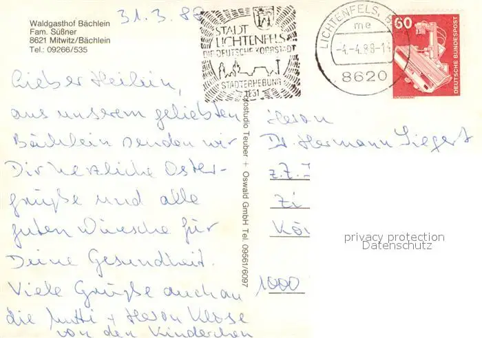 Mitwitz Waldgasthof Baechlein Restaurant Terrasse Mitwitz postalisch gelaufen 1988 Erhaltung siehe scans [FriedD77] Frierer