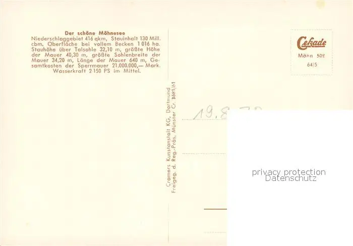 Moehnesee Fliegeraufnahme mit Staumauer Moehnesee postalisch nicht gelaufen nach 1965 Erhaltung siehe scans [WerneD78] WernPID7