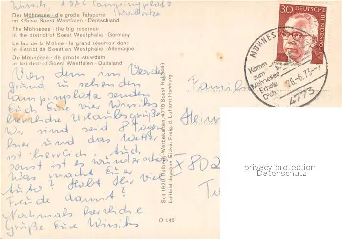 Moehnesee Fliegeraufnahme mit Talsperre Moehnesee postalisch gelaufen 1973 Erhaltung siehe scans [WerneD78] WernPID7
