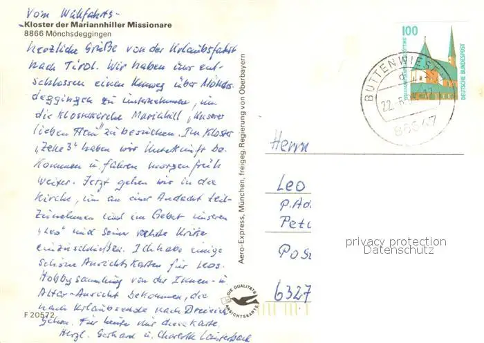 Moenchsdeggingen Kloster der Mariannhiller Missionare Fliegeraufnahme Moenchsdeggingen postalisch gelaufen 1998 Erhaltung siehe scans [WerneD78] WernPID7