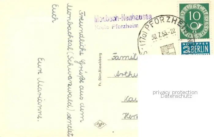 Monbach-Neuhausen_Enzkreis Waldpartie mit Ferienheim Monbach-Neuhausen postalisch gelaufen 1953 Erhaltung siehe scans [FriedD77] Frierer