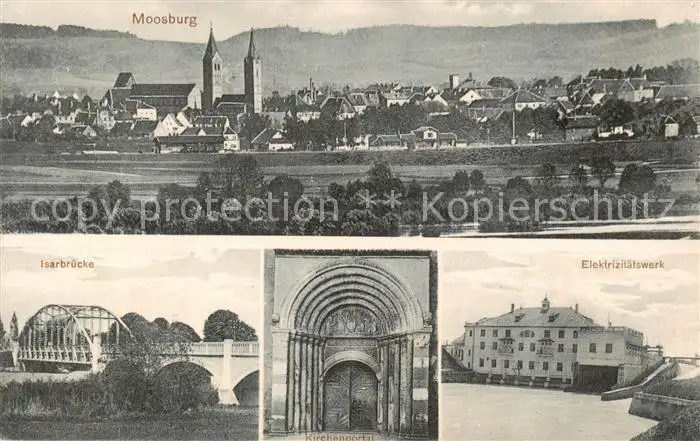AK / Ansichtskarte Moosburg_Isar Totalansicht Isarbruecke Elektrizitaetswerk Kirchenportal Moosburg Isar