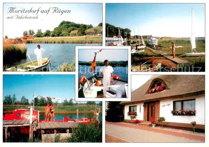 AK / Ansichtskarte Moritzdorf mit Faehrbetrieb Bootssteg Hafenpartie Reetdachhaus Moritzdorf
