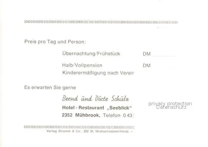 Muehbrook Hotel Restaurant Seeblick Teich Muehbrook postalisch nicht gelaufen nach 1965 Werbekarte (keine Postkarte) Erhaltung siehe scans [FriedD77] Werbekarte (keine Postkarte) Frierer