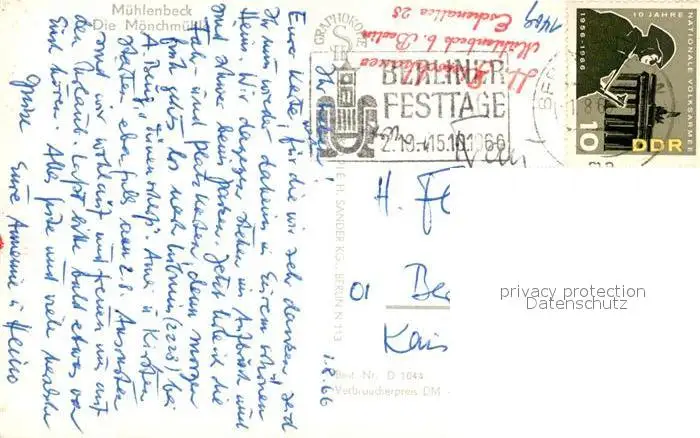 Muehlenbeck Die Moenchmuehle Muehlenbeck postalisch gelaufen 1966 Erhaltung siehe scans [WerneD78] WernPID7