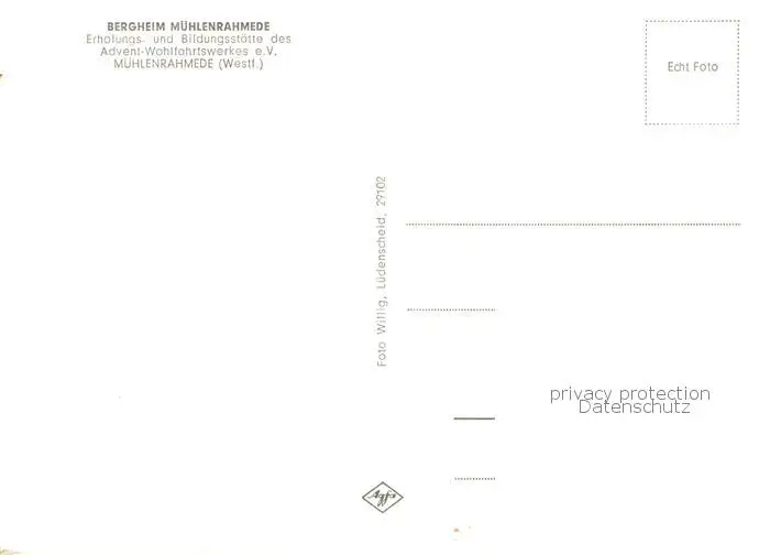 Muehlenrahmede Bergheim Erholungs- und Bildungsstaette des Advent-Wohlfahrtswerkes e.V. Muehlenrahmede postalisch nicht gelaufen nach 1965 Erhaltung siehe scans [FriedD77] Frierer