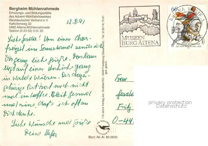 Muehlenrahmede Bergheim Muehlenrahmede Erholungs- und Bildungsstaette Muehlenrahmede postalisch gelaufen 1991 Erhaltung siehe scans [FriedD77] Frierer