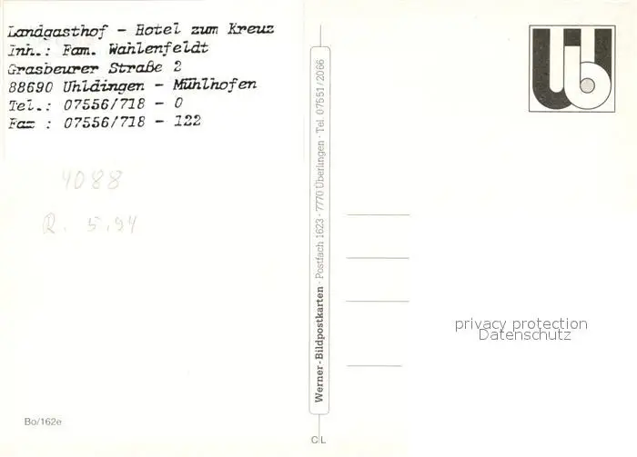 Muehlhofen_Uhldingen-Muehlhofen Hotel Gasthof Zum Kreuz Restaurant Bar Muehlhofen postalisch nicht gelaufen nach 1965 Erhaltung siehe scans [FriedD77] Frierer