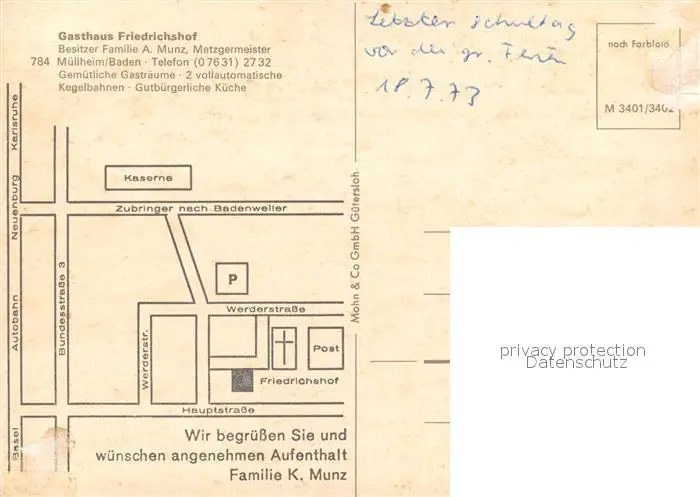 Muellheim_Baden Gasthaus Friedrichshof Kegelbahn Muellheim_Baden postalisch nicht gelaufen 1973 Erhaltung siehe scans [WerneD78] WernPID7