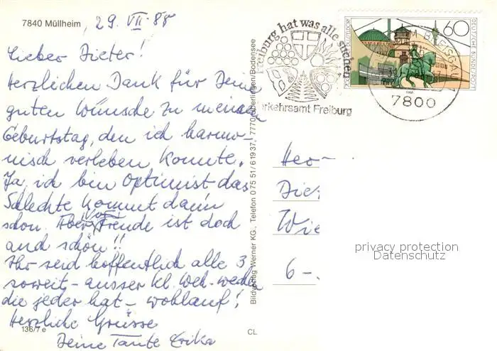 Muellheim_Baden Innenstadt Kirche Brunnen Skulptur Statue Landschaftspanorama Muellheim_Baden postalisch gelaufen 1988 Erhaltung siehe scans [FriedD77] Frierer