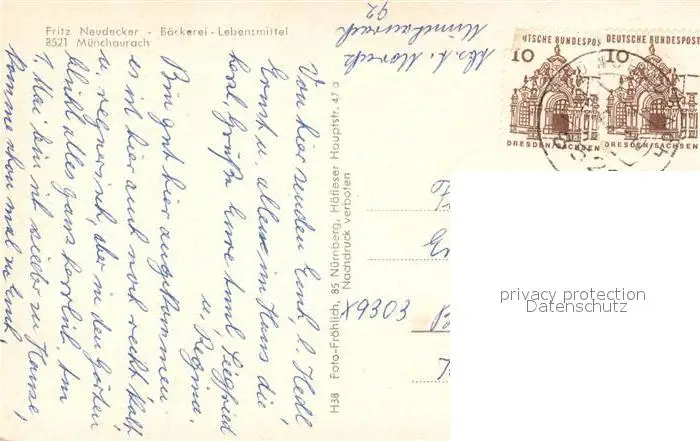Muenchaurach Kategorie Alte Ansichtskarten Postkarten bx66382 Muenchaurach Panorama Baeckerei Neudecker Kirche Rathaus Muenchaurach postalisch gelaufen nach 1965 Erhaltung siehe scans [WerneD78]