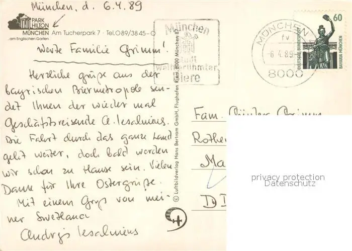 Muenchen Fliegeraufnahme mit Park Hilton am Englischen Garten Muenchen postalisch gelaufen 1989 Erhaltung siehe scans [WerneD78] WernPID7