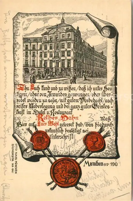 AK / Ansichtskarte Muenchen Hotel Restaurant Roter Hahn Siegel Muenchen