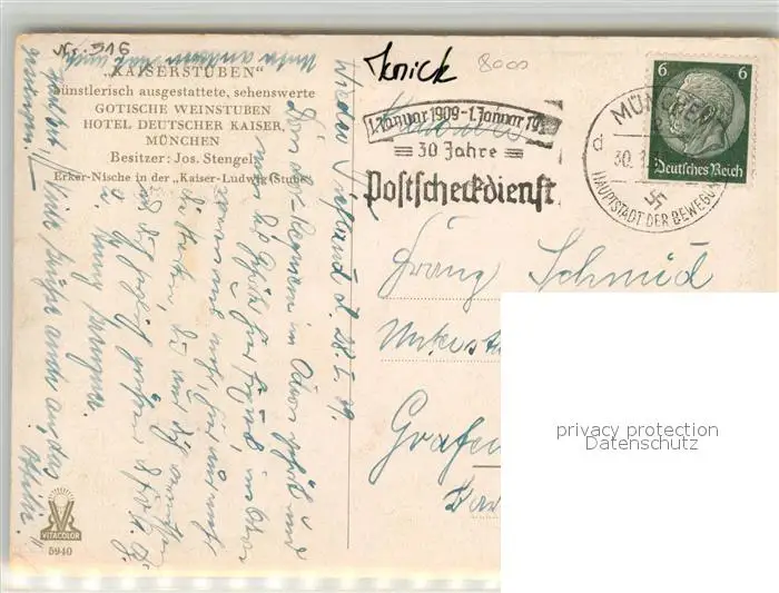 Muenchen Kaiserstuben Hotel Deutscher Kaiser Muenchen postalisch gelaufen 1939 Erhaltung siehe scans [FriedD77] Frierer