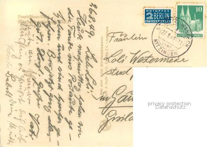 Muensterschwarzach Benediktiner Abtei Mainpartie Muensterschwarzach postalisch gelaufen 1949 Erhaltung siehe scans [FriedD77] Frierer