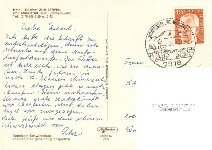 Muenstertal_Schwarzwald Hotel Gasthof zum Loewen Freibad Panorama Landschaftspanorama Muenstertal_Schwarzwald postalisch gelaufen 1975 Erhaltung siehe scans [FriedD77] Frierer