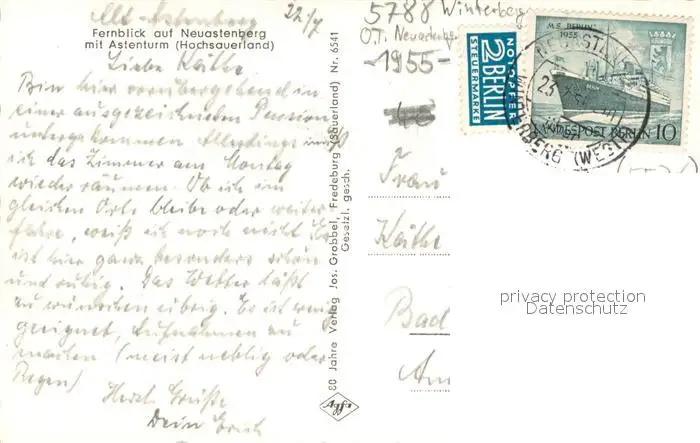 Neuastenberg Panorama mit Astenturm Neuastenberg postalisch gelaufen 1955 Erhaltung siehe scans [WerneD78] WernPID7