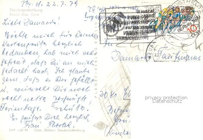 Neubrandenburg Hotel Vier Tore Denkmal Wasserspiele Neubrandenburg postalisch gelaufen 1979 Erhaltung siehe scans [FriedD77] Frierer
