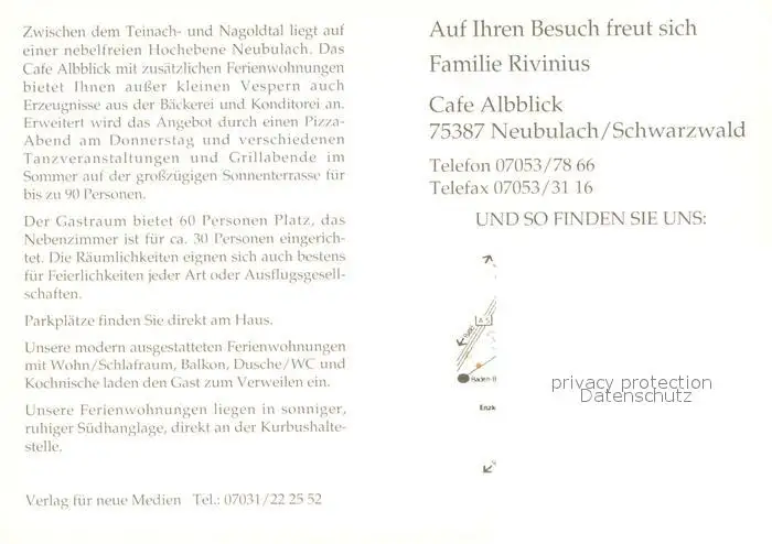 Neubulach Cafe Albblick Kaminzimmer Gaestezimmer Gaststube Rivinius Neubulach postalisch nicht gelaufen nach 1965 Werbekarte (keine Postkarte) Erhaltung siehe scans [WerneD78] Werbekarte (keine Postkarte) WernPID7