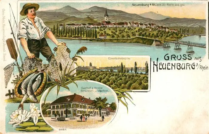 Neuenburg Rhein Kategorie Alte Ansichtskarten Postkarten bx56292 Neuenburg_Rhein Gasthaus Krone Eisenbahnbruecke Neuenburg Rhein postalisch gelaufen Erhaltung siehe scans [NatalD47]
