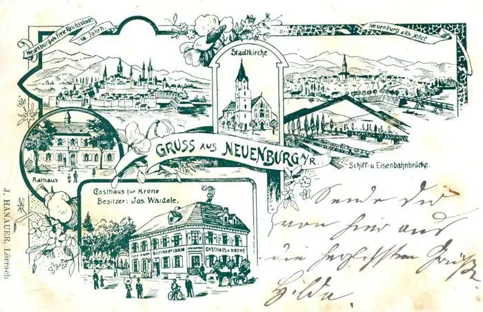Neuenburg Rhein Kategorie Alte Ansichtskarten Postkarten bx56422 Neuenburg_Rhein Stadtkirche Gasthaus Krone Rathaus Neuenburg Rhein postalisch gelaufen 1903 Erhaltung siehe scans [NatalD47]