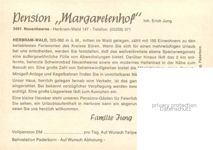 Neuenheerse Pension Margaretenhof Garten Aufenthaltsraum Clubraum Speisesaal Gaestezimmer Neuenheerse postalisch nicht gelaufen nach 1965 Erhaltung siehe scans [FriedD77] Frierer
