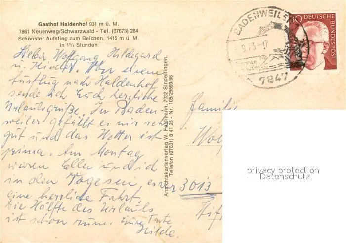 Neuenweg Strohmeyers Gedaechtniskapelle Haldenhof Nonnenmattweiher Belchen Gastraum Neuenweg postalisch gelaufen 1973 Erhaltung siehe scans [WerneD78] WernPID7