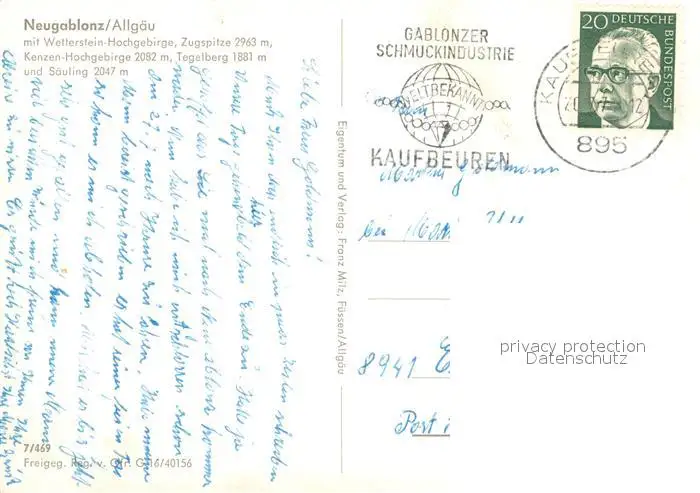 Neugablonz Fliegeraufnahme mit Wettersteingebirge Zugspitze Tegelberg und Saeuling Neugablonz postalisch gelaufen 1972 Erhaltung siehe scans [WerneD78] WernPID7