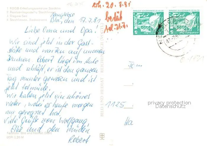 Neuglobsow FDGB Erholungsheim Stechlin Bootsanlegestelle Stechlinsee Dagowsee Badestrand Neuglobsow postalisch gelaufen 1981 Erhaltung siehe scans [FriedD77] Frierer
