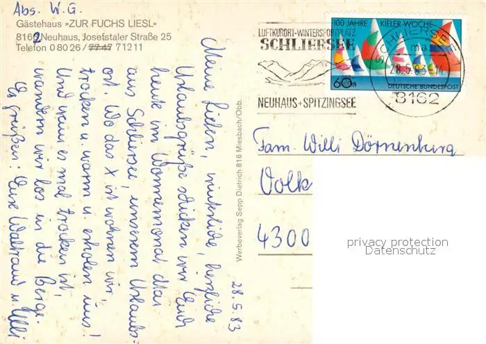 Neuhaus_Schliersee Gaestehaus Zur Fuchs Liesl Neuhaus Schliersee postalisch gelaufen 1983 Erhaltung siehe scans [WerneD78] WernPID7