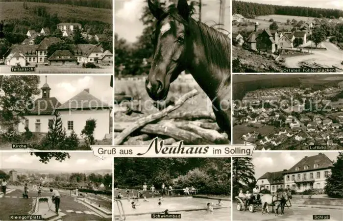 AK / Ansichtskarte Neuhaus_Solling Kirche Kleingolfplatz Schwimmbad Schloss Fohlenplacken Neuhaus Solling