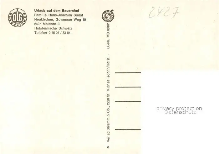Neukirchen_Eutin Urlaub auf dem Bauernhof Ferienhof Soost Naturpark Holsteinische Schweiz Neukirchen Eutin postalisch nicht gelaufen nach 1965 Erhaltung siehe scans [FriedD77] Frierer